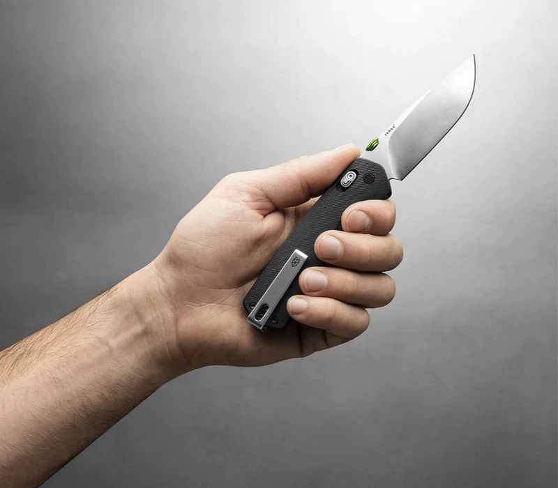 Eine 8,4 cm lange und scharfe Drop Point Klinge aus VG-10 Stahl sorgt für das nötige Schneiderlebnis. Um diese zu nutzen, lässt sie sich über einen Daumenlifter in Position bringen, dank der Phosphor-bronzenen Washer läuft sie wie auf dem Laufsteg. Für die Griffe hat man robustes G10 gewählt, dieses liegt durch seine ergonomische Form hervorragend in der Hand. Für die Sicherheit sorgt ein beidseitiger Slide Lock. Und zum Schluss hat er noch einen Clip in Tip-Up-Position, um es immer in der Hosentasche bei sich zu haben.