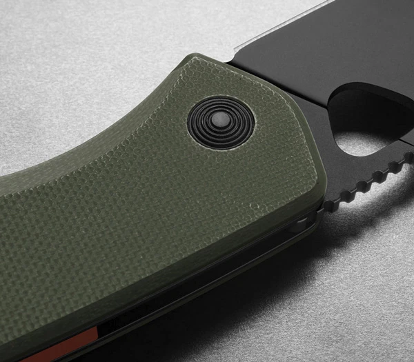 Für die Griffe aus G10 wurde die bei Sammlern und Nutzern beliebte Farbe OD Grün gewählt, und als zusätzlichen Hingucker hat man den Backspacer und die Fangriemenöse in Orange hinzugefügt. Die Farbkombination ist echt der Wahnsinn. Hinzu kommt noch die schwarze PVD beschichtete Drop Point Klinge aus VG10 Stahl mit praktischem Jimping auf dem Klingenrücken. Die Klinge lässt sich leicht und geschmeidig über das Daumenloch öffnen, dank der Phosphor-bronzenen Washer, da ist der Spielfaktor garantiert.