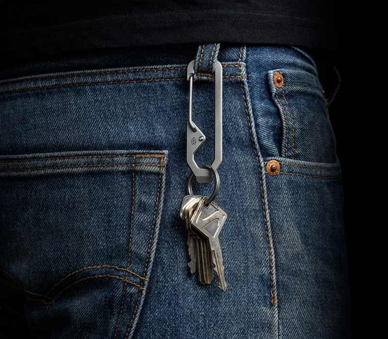 „Wo sind denn nur meine Schlüssel schon wieder hin?“ – Tja, mit dieser Frage muss man sich in Zukunft wohl nicht mehr herumplagen. Denn der „The Holcombe Titanium“ Karabiner von The James Brand sorgt dafür, dass dein Auto- oder Hausschlüssel immer sicher und stilvoll verstaut ist. Einfach den Drahtschnapper beiseite geschoben, den Schlüssel rein und in die Gürtelschlaufe eingehangen – und schon steht man nie wieder ohne da. Als noch edlere Variante kommt das Tool hier in kompletter Titan-Ausstattung. Das Design ist genau auf die Maße einer normalen Gürtelschlaufe angepasst, wodurch das Holcombe besonders sicher sitzt. Nach dem Einhaken rutscht der Schlüssel dann in das untere Abteil, in welchem er dann auch bleibt. Zusätzlich kann das Holcombe auch als Schaber, Hebeltool oder auch als Schraubenzieher benutzt werden.