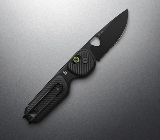 Schauen wir mal, was uns dieses schöne Stück so alles mitbringt. Fangen wir mal mit der Klinge an. Eine 6,3 cm lange Drop Point Klinge mit Teilwellenschliff aus 12C27 Sandvik Stahl, die, um unschöne Kratzer zu vermeiden und um richtig sexy auszusehen, eine schwarze PVD Beschichtung bekommen hat. Fängt doch schon mal gut an, oder was meint Ihr? Die ergonomischen Griffe aus Polypropylen liegen so gut in der Hand, dass man denken könnte, er sei aus Seide. Aber so ganz konnte man bei diesem ganz in Schwarz gehaltenen Folder wohl doch nicht auf Farbe verzichten und hat dem Slide Lock einen knallgrünen Anstrich verpasst, und ich finde, das sieht richtig gut aus. An der Fangriemenöse kann man ein farblich passendes Lanyard anbringen und dem Messer so einen persönlichen Look verpassen.