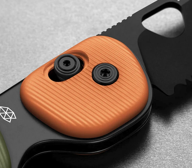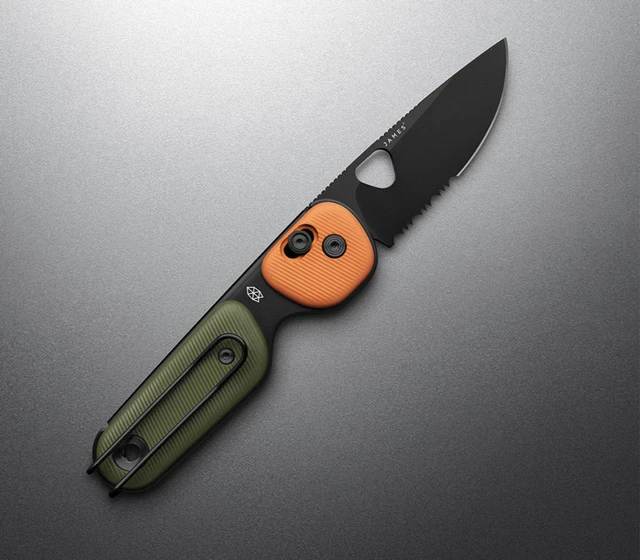 Schauen wir mal näher hin. Eine 6,3 cm lange, schwarze PVD beschichtete Klinge mit Teilwellenschliff und praktischem Jimping auf dem Klingenrücken aus 12C27 Sandvik Stahl wird begleitet von einem Griff aus Polypropylen in, wie schon erwähnt, OD Green und Orange. Die Griffe liegen sehr ergonomisch in der Hand und selbst längere Arbeiten damit lassen sich ohne hässliche Druckstellen durchführen. Damit man diesen EDC-Folder immer bei sich tragen kann, wurde ein Tip Up Drahtclip verbaut, dezent aber nützlich.