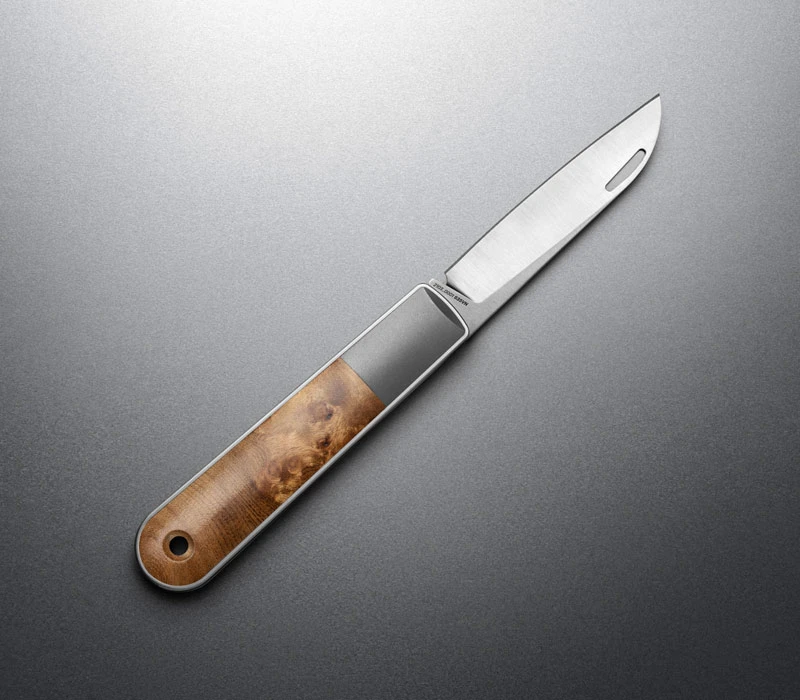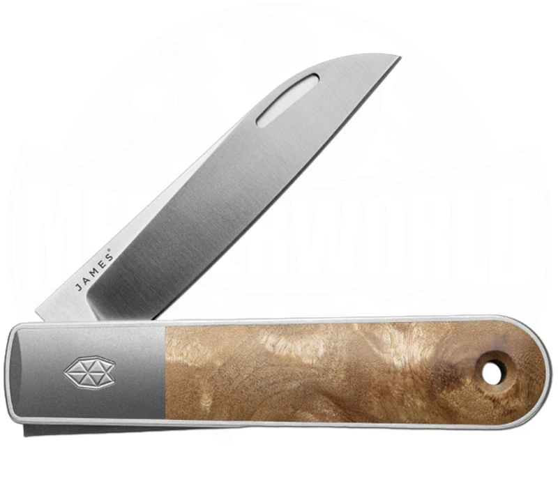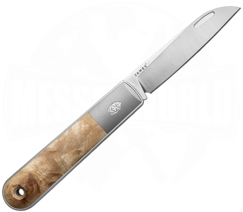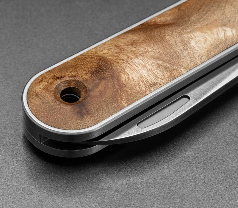 Ausgestattet mit einer 7,6 cm langen Sheeopfootklinge aus CPMS35VN Stahl ist er ein kleiner Schneidteufel. Der Crucible Stahl zählt zu den Highend-Stählen auf dem Markt und zeichnet sich durch seine hohe Korrosionsbeständigkeit und lang anhaltende Schärfe aus. Für die Griffe wurde wunderschönes Sycamorholz gewählt, welches zu den Platanengewächsen aus Nordamerika gehört. Über einen feinen Nagelhau lässt sich die Klinge des Slipjoint-Messers einfach in Position bringen, ja, Ihr habt richtig gehört, es ist ein Slipjoint und somit legal in Deutschland zu führen. Na, wenn das mal keine super Info ist!